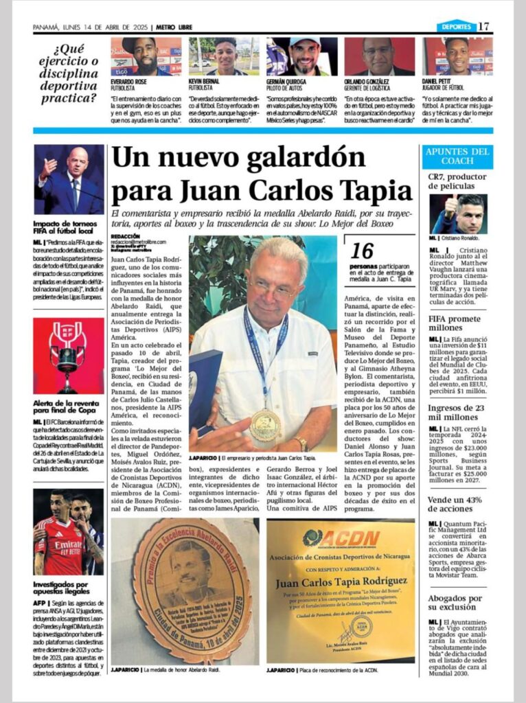 Los medios impresos de Panamá reflejan la brillante carrera de Juan Carlos Tapia, quien además es miembro de la AIPS, lo que otorga aún mayor relevancia a este merecido galardón.