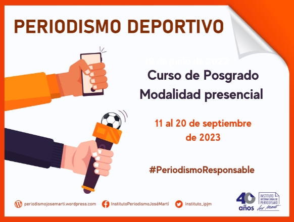 (Por AIPS AMÉRICA).- La Cátedra de Periodismo Deportivo del Instituto Internacional de Periodismo José Martí, de la Unión de Periodistas de Cuba (UPEC), convoca a la decimosexta edición del Curso de Posgrado de Periodismo Deportivo, del 11 al 20 de septiembre de 2023, en La Habana.