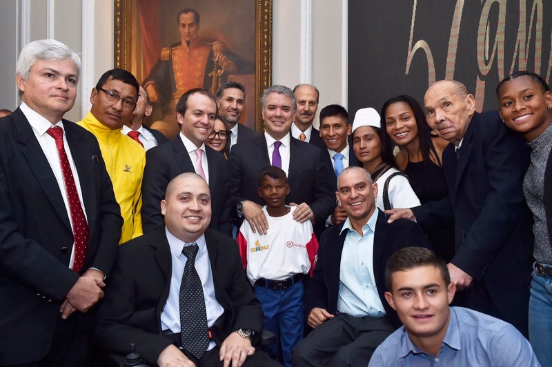 - Los atlteas colombianos, acompañandos del Presidente de la República Iván Duque y del Director de Coldeportes, Ernesto Lucena. / Colombian athletes with Ivan Duque, President of Colombia and Ernesto Lucena, Director of Coldeportes.