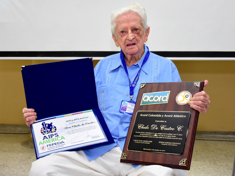 Por ello, este miércoles 4 de octubre, AIPS, AIPS América y ACORD Colombia, le han rendido, junto a la Alcaldía de su ciudad, Barranquilla, un homenaje y le han entregado una plaqueta y un diploma, que testimonian la mencionada condición, durante un sencillo acto al cual ha asistido Don Chelo, acompañado de dos de sus hijos y uno de sus nietos, y en el cual estuvo rodeado por periodistas de varias generaciones que admiran su trabajo.