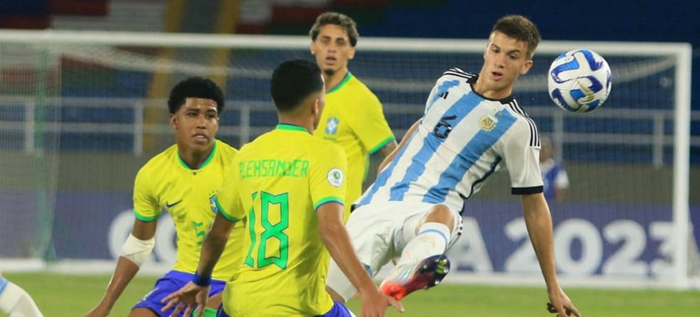 Argentina se equivocó en defensa, el golero Gomes derribó a Vitor Roque. Ejecutó el mismo Roque y convirtió el 3-0 a los 41 minutos.