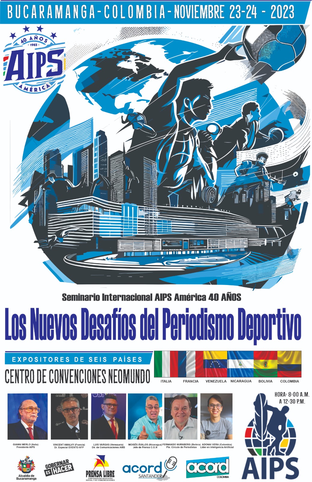 Destacados lideres del periodismo del continente americano disertarán sobre temas de actualidad periodística en el deporte durante el Seminario Internacional que tendrá lugar en Bucaramanga durante los días 23 y 24 de noviembre, en el marco del Congreso anual y la celebración de los 40 años de AIPS AMÉRICA.