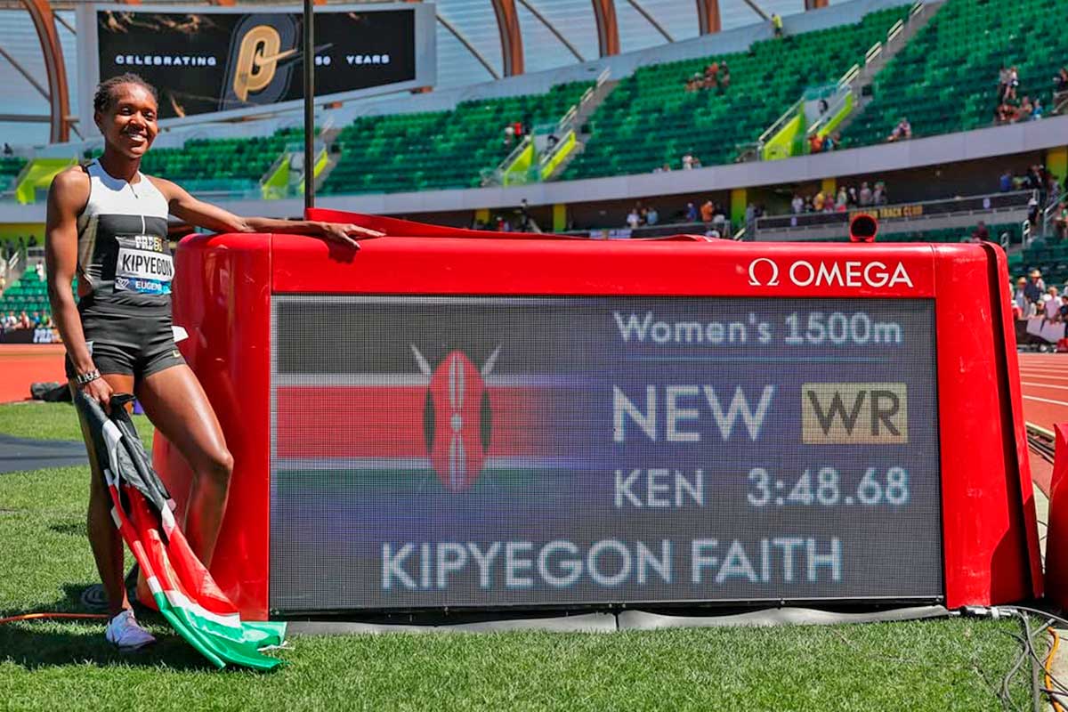 Por su parte, Faith Kipyegon, quien venía de mejorar su marca mundial de la milla (4:07.64), en París, en un reto no homologado (4:06.42), se impuso en Eugene, en los 1.500 metros planos, con un tiempo de 3:48.68, con el que superó su propio récord (3:49.04), logrado el año pasao, también en París.