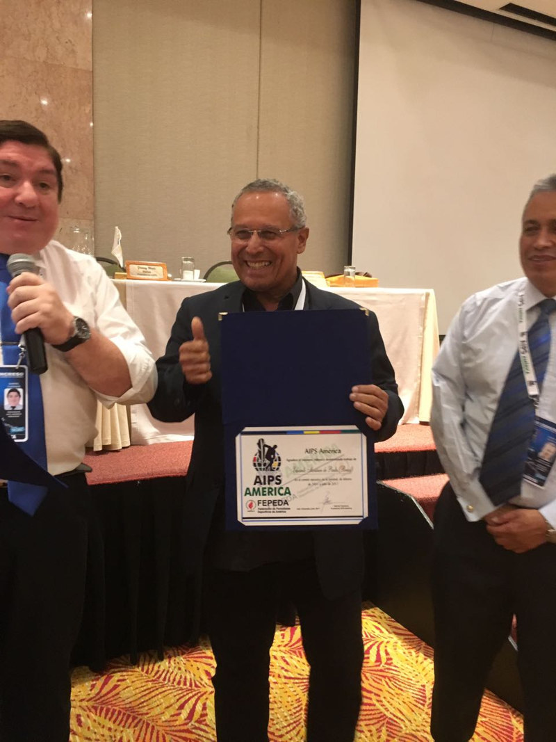 Dudu, recibiendo un agradecimiento de AIPS América por haber organizado cuatro eventos oficiales en el cierre de su mandato 2011/2017 en el comité ejecutivo. Este año sumó uno.