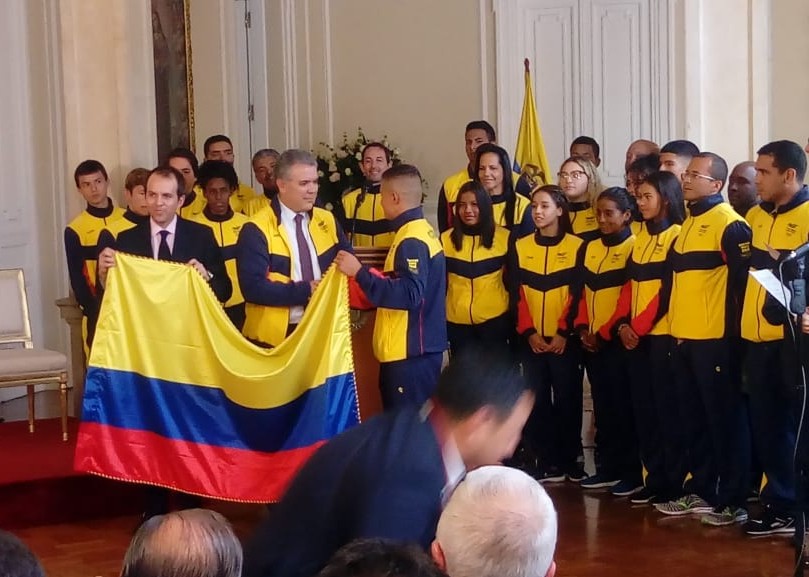 BOGOTÁ, Colombia 19 de septiembre de 2018.– El presidente de la República de Colombia, Iván Duque Márquez, entregó la bandera a la delegación nacional que estará participando en los III Juegos Olímpicos de la Juventud, que se realizarán del 6 al 18 de octubre en la ciudad de Buenos Aires, Argentina.