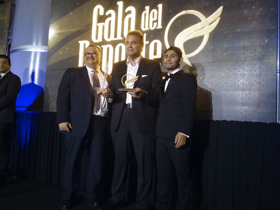 Favid Faitelson (centro), tras recibir el galardón “Abelardo”Raidi” de AIPS América, de manos de Alberto Rico (izq.), presidente de FEMECRODE y tesorero de AIPS América.