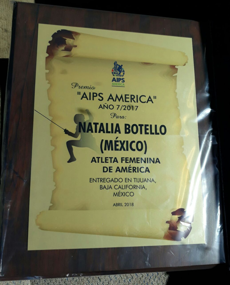 TIJUANA, Baja California, 30 de abril de 2018.- La Asociación de Periodistas Deportivos (AIPS) América, entregó un merecido reconocimiento como mejor atleta femenina del continente en el año 2017 a la juvenil esgrimista bajacaliforniana Natalia Botello, por sus importantes logros alcanzados.