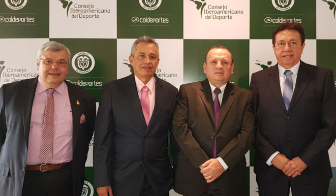 Ernesto Ortiz (presidente del Círculo de Periodistas Deportivos del Uruguay), Carlos Julio Castellanos (vicepresidente 1° de AIPS América), Faiver Hoyos (presidente Acord Colombia) y Kleiber Beltrao (vicepresidente para Sudamérica de AIPS América y presidente de ABRACE -Brasil-) en la asamblea del CID, el pasado mes de abril, en Cali, Colombia.