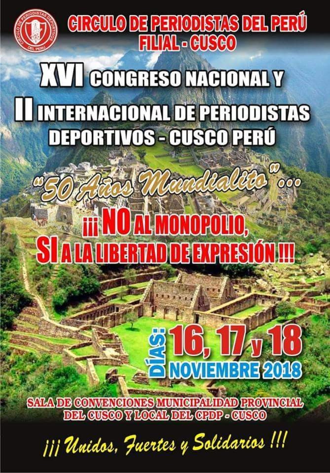 El XVI Congreso Nacional II Internacional organizado por el Círculo de Perú, se verificará en la ciudad de Cusco, del 16 al 18 de noviembre. La organización comunicó que se hace cargo de la hospitalidad completa de los inscriptos del exterior, incluyendo una visita al legado inca de Machu Pichu. Solo no se ofrece el traslado aéreo. El vicepresidente de AIPS América para el área de Sudamerica, Kleiber Beltrao (Brasil) ya ha comprometido su presencia.