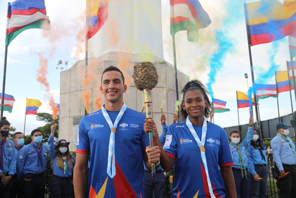 La atleta Valeria Cabezas, abanderada de la delegación Colombia en estas competencias y quien obtuvo una medalla de oro en los Juegos Olímpicos de la Juventud de 2018 en la categoría 400 metros con vallas femenino y el nadador Juan Manuel Morales, quien alcanzó su primera medalla de oro a los 12 años en un interclub realizado en Medellín en el 2018, portaron con orgullo el fuego de los Juegos Panamericanos Junior e iniciaron el recorrido del relevo de la antorcha en medio de una calle de honor formada por los asistentes e invitados especiales.
