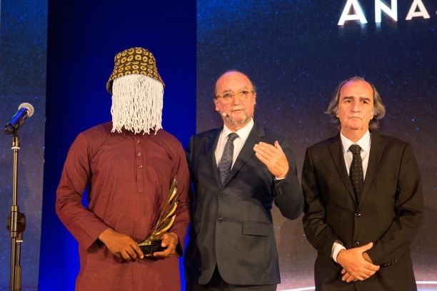- Anas Aremeyaw (Ghana), premio especial en investigación, con el presidente y el vicepresidente 1° de AIPS, Gianni Merlo (Italis) y Esat Yilmaer (Turquía), respectivamente