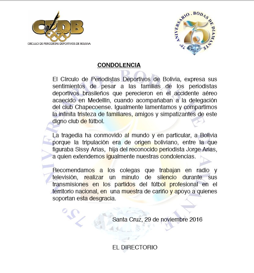 Asunción, 30 de noviembre de 2016.- Los Círculos de Periodistas Deportivos de Venezuela y Bolivia hicieron llegar asimismo cartas oficiales dirigidas a ABRACE y AIPS América, con motivo del fallecimiento de 21 periodistas deportivos y otros 50 integrantes de la comitiva del Chapecoense en el accidente aéreo del pasado lunes a la medianoche.