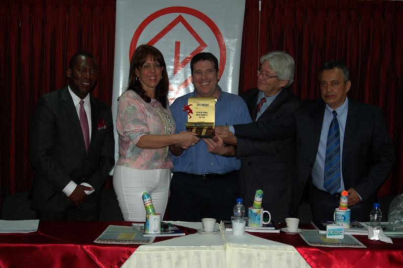 Momento en que los representantes de AIPS América, Enrique Montesinos y Carlos Julio Castellanos (segundo y primero desde la derecha) entregan el premio AIPS América 2013 a los representantes de los Juegos Mundiales Cali 2013, Clara Luz Roldán y Juan Esteban Angel Borrero. / Moment in that representatives of AIPS America, Enrique Montesinos and Carlos Julio Castellanos (second and first from right) deliver the AIPS America Award 2013 to representatives of the World Games Cali 2013, Clara Luz Roldán y Juan Esteban Angel Borrero.