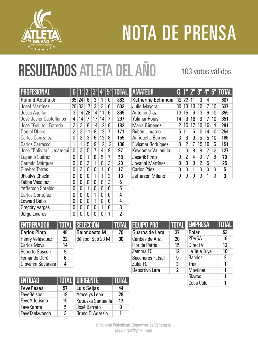 Acuña Jr. prevailed in the election to Josef Martinez, the Most Valuable Player of the Soccer Major League, who also received strong support among voters. Ronald totaled 863 points, with 65 votes as winner, 24 as the runner up, six for second place, three for third and one for the fourth position. Martínez closed with 602 units.