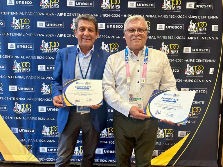 La celebración de los 100 años de la Asociación Internacional de Prensa Deportiva – AIPS tuvo lugar en la sede de la UNESCO, en París, en el marco de los Juegos Olímpicos, donde los Periodistas colombianos y miembros de Acord Bogotá, Héctor Urrego y Carlos Julio Guzmán, fueron reconocidos por su trayectoria en el Periodismo Deportivo, al contabilizar más de 10 cubrimientos de las justas multideportivas más importantes del planeta, los dos estuvieron acompañados de 112 colegas de los cinco continentes, escribiendo sus nombres en la conmemoración “Periodistas en el Podio” de la AIPS.